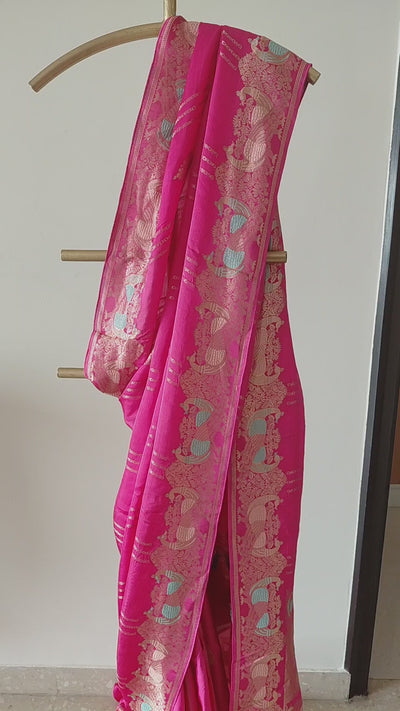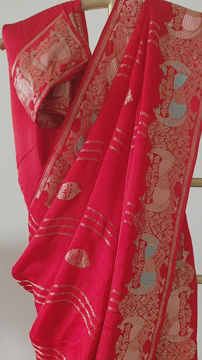 Mashru Silk Saree with Peacock Motifs in Zari Weaving