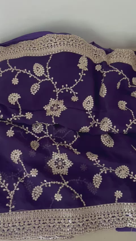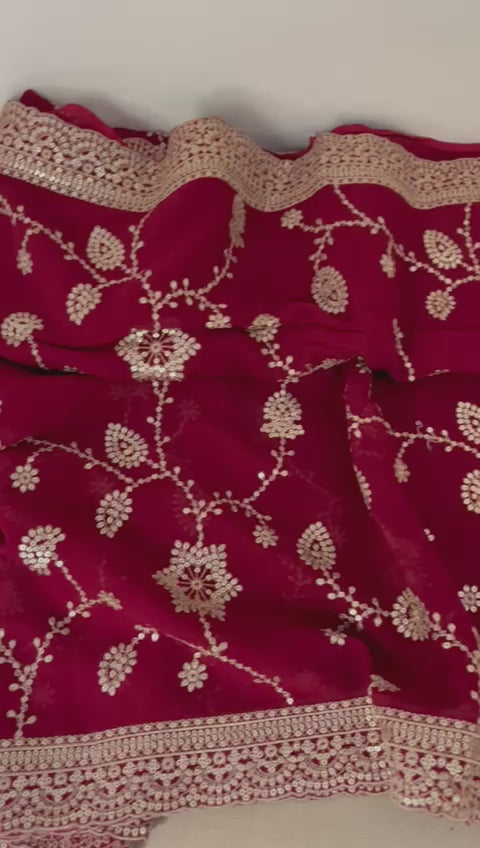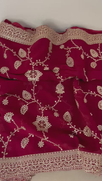 "Indulge in the timeless artistry of Indian heritage with our Pure Georgette Dabka Jaal Saree. This isn't just a garment; it is a masterpiece of precision. Set against a regal midnight blue and hot pink color options, the intricate Dabka (fine metal thread) and sequin Jaal (mesh) work across the body creates a mesmerizing shimmer that mimics a starlit sky. Perfect for a grand reception or a milestone celebration, this saree is for the woman who demands excellence in every thread."